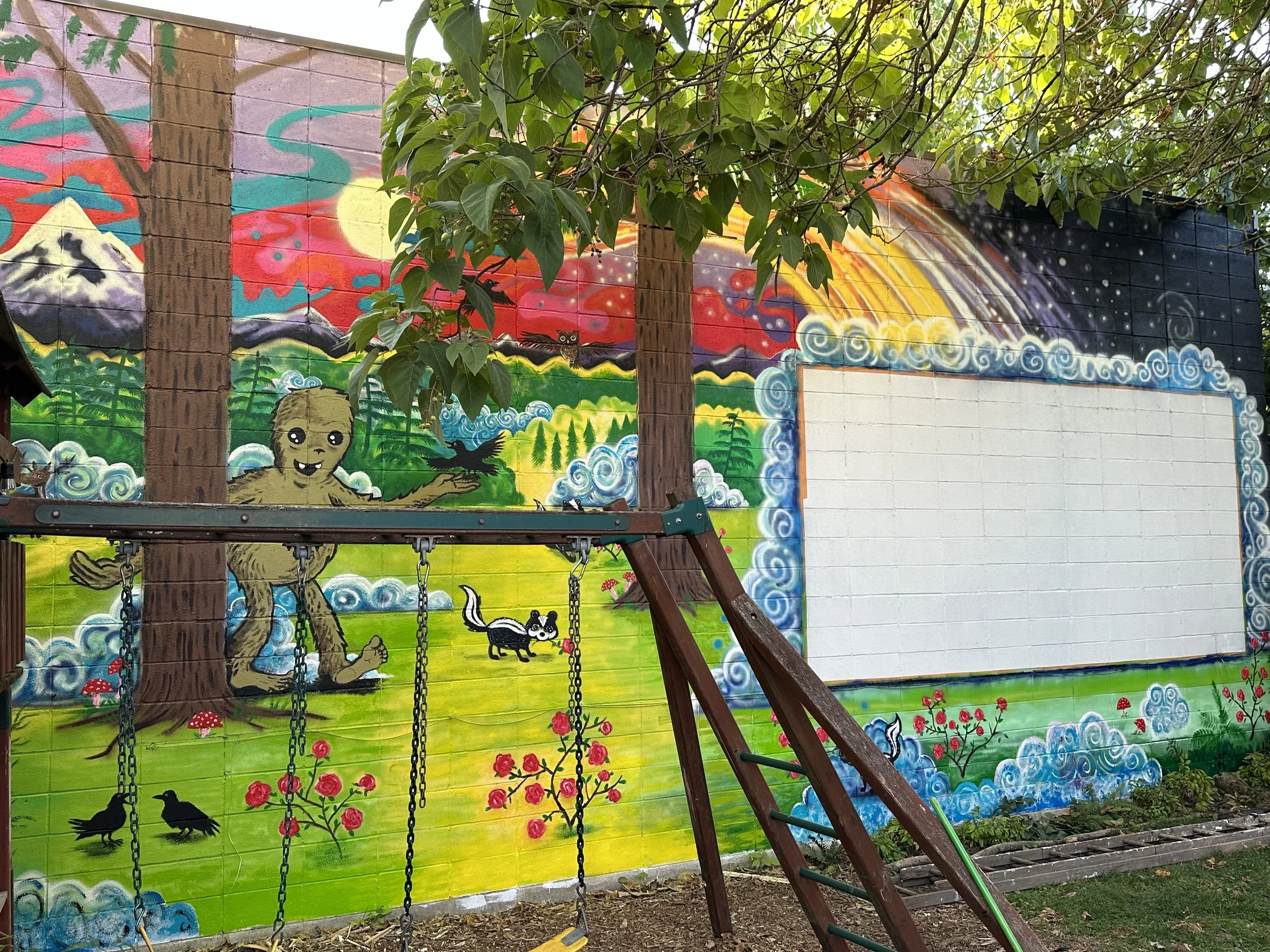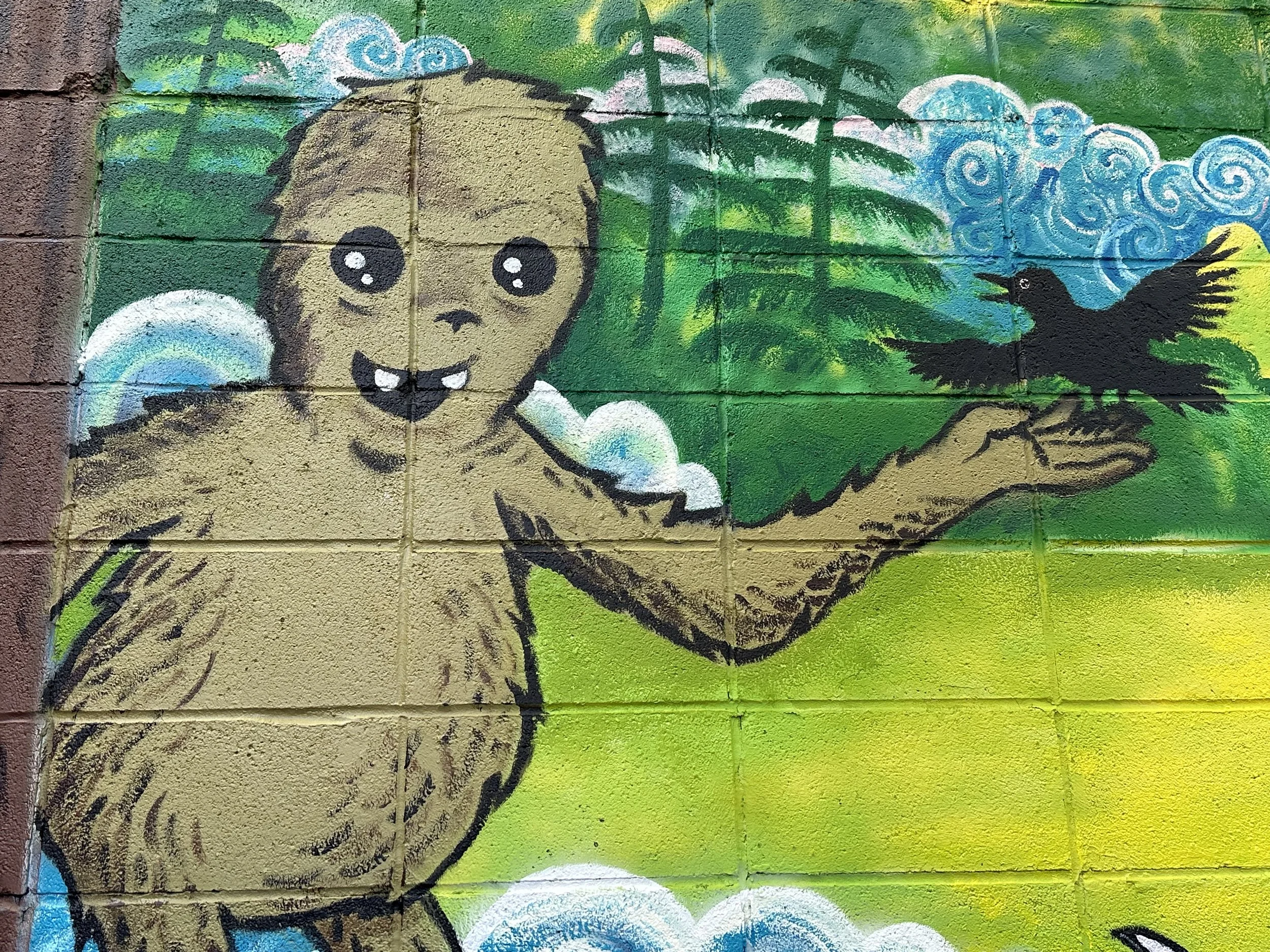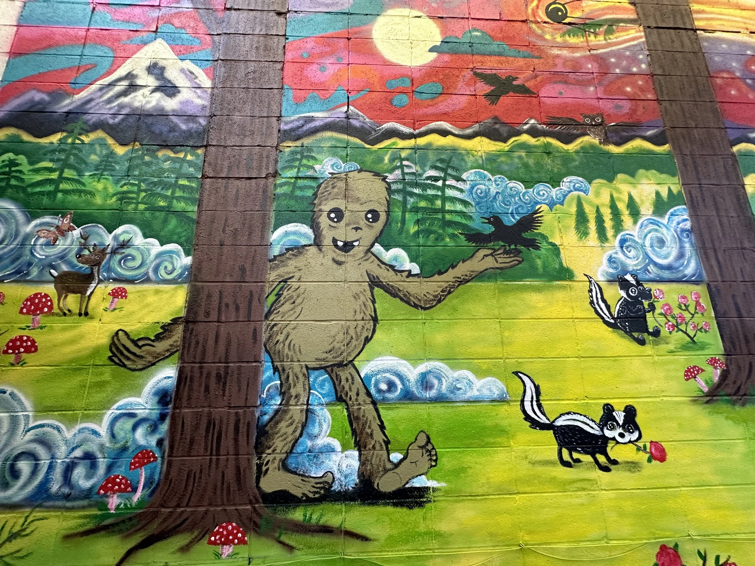 This 40’w x 20’h mural, featuring Little Squatchee and his woodland friends, lives at a private residence in Portland OR.